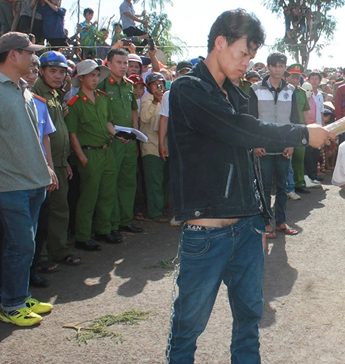 Nghi phạm đang thực nghiệm hiện trường. Ảnh: T.Anh