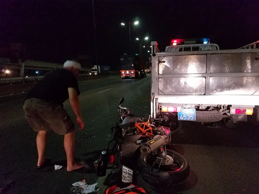 Trong lúc lực lượng chức năng đang phong tỏa, khám nghiệm hiện trường thì bất ngờ chiếc mô tô 59A3 – 117.91 do hai người nước ngoài chở nhau chạy từ hướng quận Bình Thạnh về quận Thủ Đức tông thẳng vào vào đuôi xe cảnh sát đang xử lý hiện trường.
