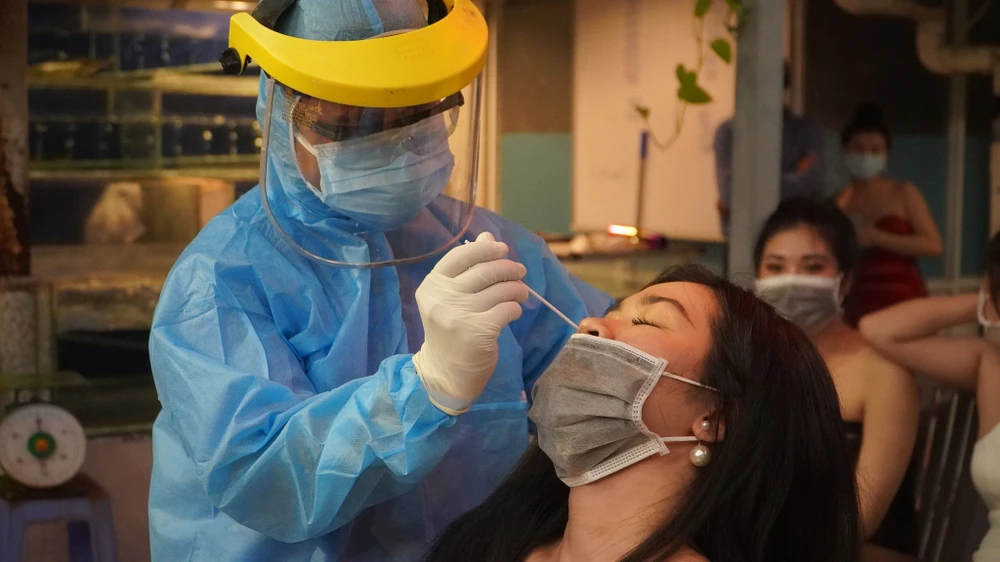 Lấy mẫu xét nghiệm cho các nữ tiếp viên tại nhà hàng trên đường Ung Văn Khiêm. Ảnh: MINH TÂM