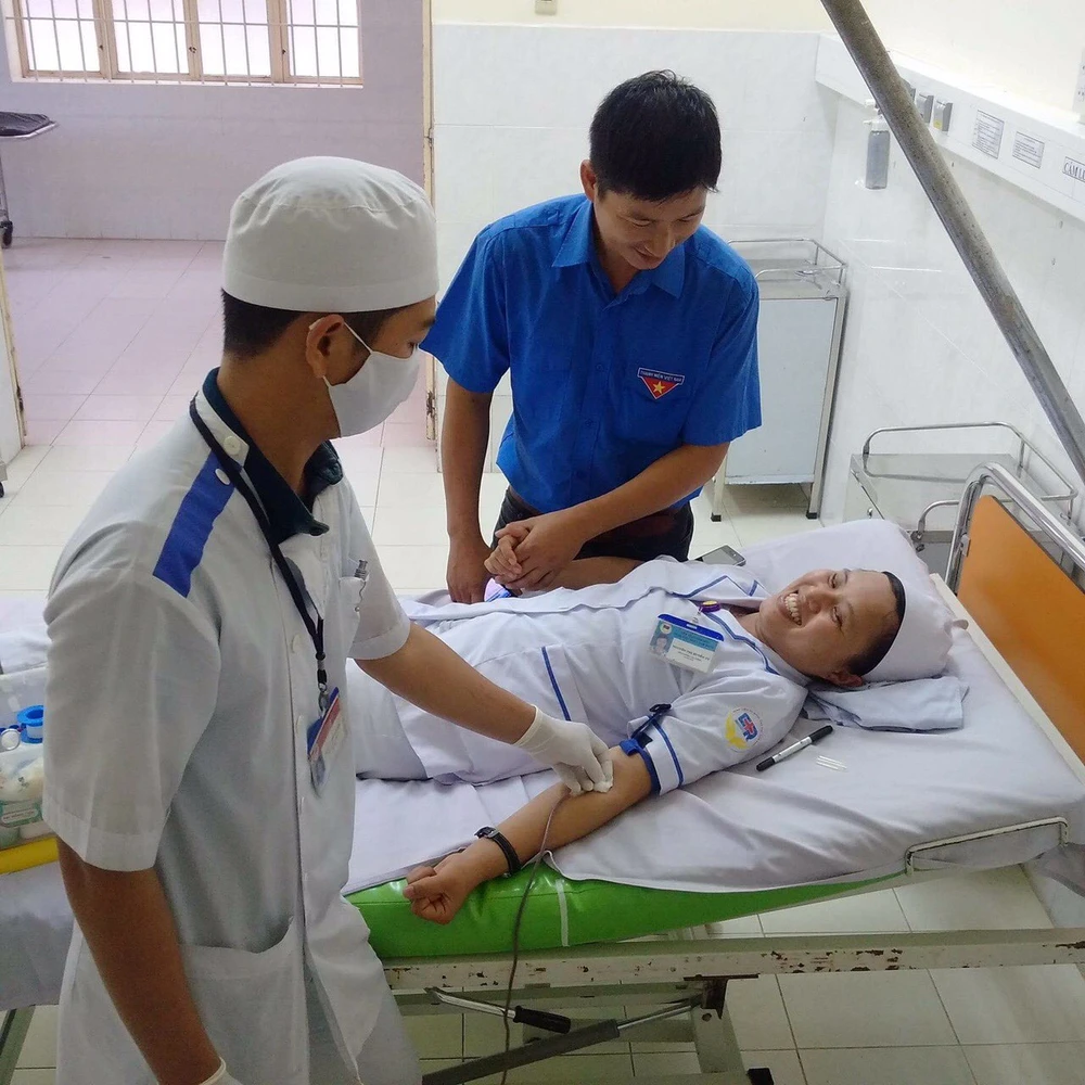 Chị Nguyễn Thị Huyền Vy trong lúc hiến máu giúp sản phụ cấp cứu khi sinh mổ. Ảnh: CÔNG THI