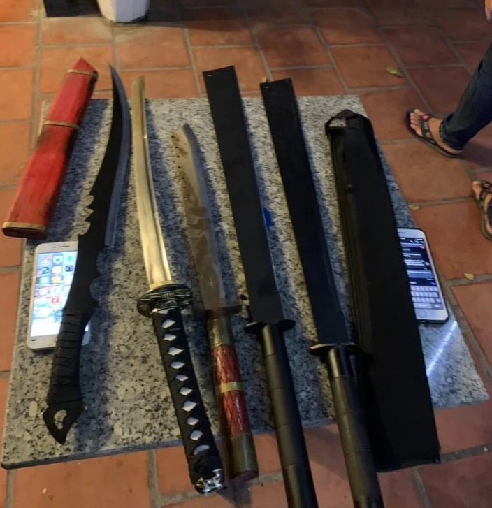 Tại đây công an còn thu giữ năm cây mã tấu, kiếm Nhật.