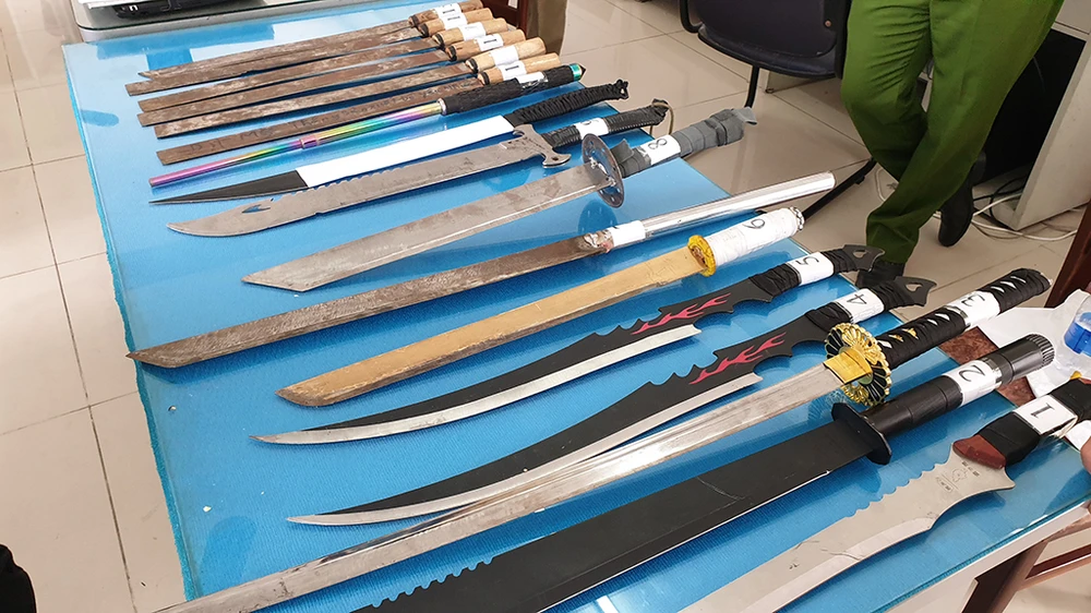 Số lượng hung khí bị công an thu giữ sau khi vụ việc xảy ra. Ảnh: CA