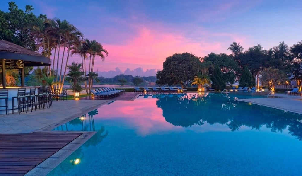 Hồ bơi nước mặn nằm bên dòng sông Hương, nhìn sang kinh thành Huế.