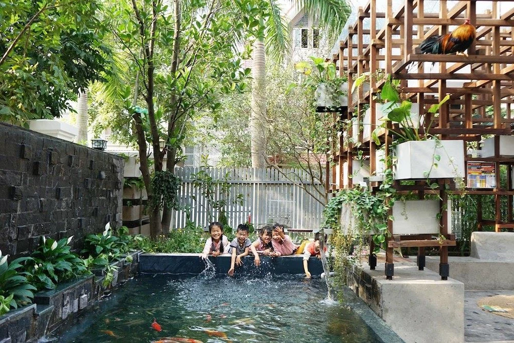 Trẻ em chơi đùa tại hồ cá koi trong Thư viện VAC.