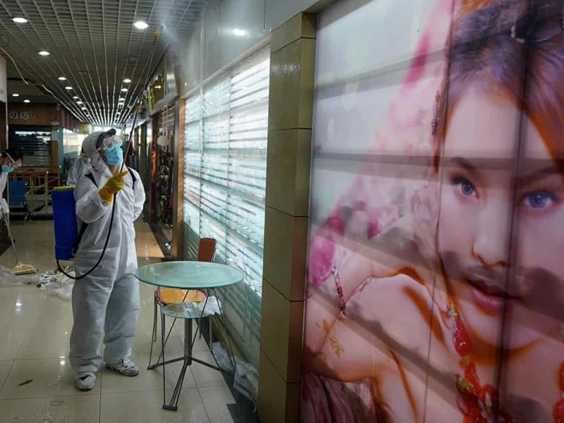 Các nhân viên phun xịt khử trùng một khu vực mua sắm nhỏ ở TP Vũ Hán trước khi cho phép hoạt động kinh doanh quay trở lại. Ảnh: TÂN HOA XÃ