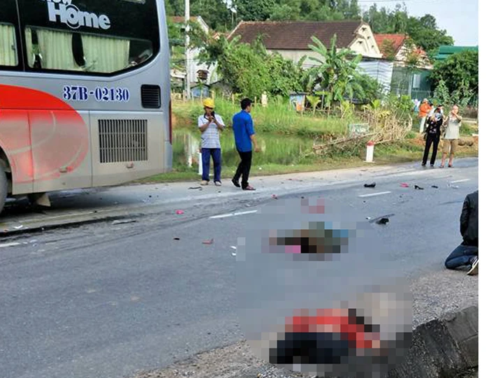 Cú tông mạnh khiến chị Liên và chị Loan văng ra mặt đường, tử vong tại chỗ. Xe máy nát hỏng, xe khách bị móp phần đầu.