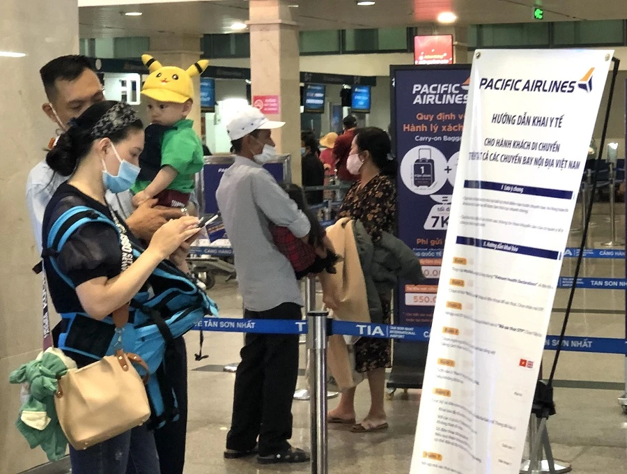 Khách tuân thủ khai báo y tế trước khi vào khu vực kiểm tra an ninh tại Cảng HKQT Tân Sơn Nhất. Ảnh: PHONG ĐIỀN