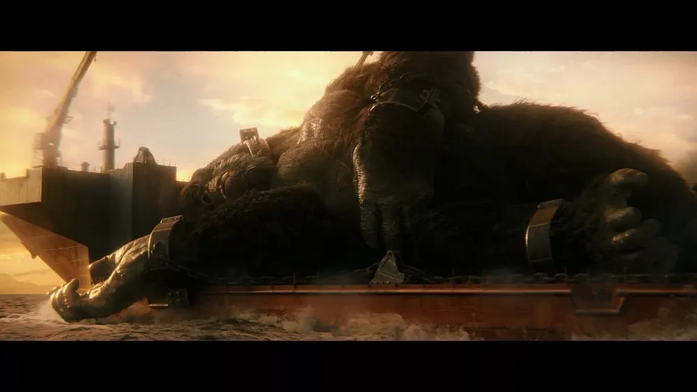 Lúc này, Kong với kích thước lớn gấp nhiều lần so với phần đầu tiên của chuỗi phim đã bị bắt từ Đảo Đầu Lâu - địa điểm quay ở Ninh Bình (Việt Nam) giờ bị xiềng xích trên chuyến tàu chở hàng lênh đênh trên biển.