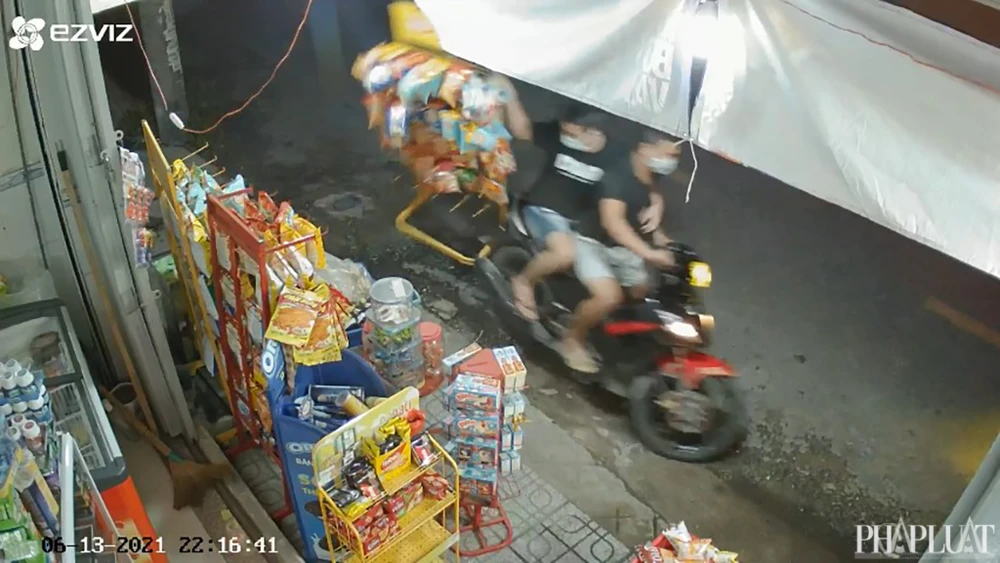 Theo hình ảnh, tối ngày 13-6, hai thanh niên không đội nón bảo hiểm, chở nhau trên xe máy. Khi chạy đến trước cửa hàng tạp hóa của anh H. thì người ngồi sau đưa tay lấy cả khung sắt treo hàng chục gói bánh bim bim rồi cả hai bỏ tăng ga bỏ chạy.