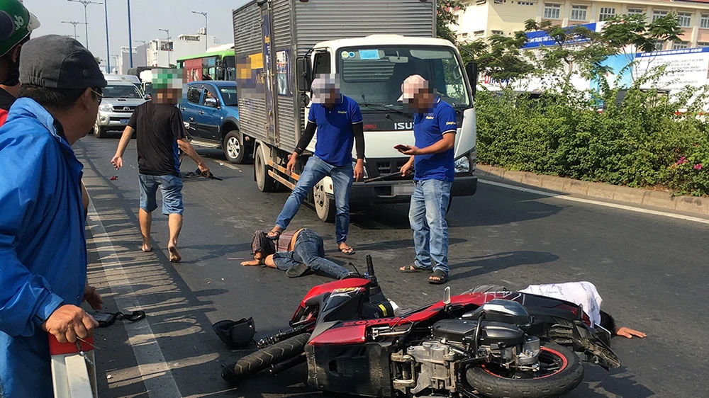 Khi đến cầu bộ hành số 6, đường Võ Văn Kiệt (quận 6) xe máy được cho là va chạm với một phương tiện khác khiến hai thanh niên té ra đường, trọng thương.