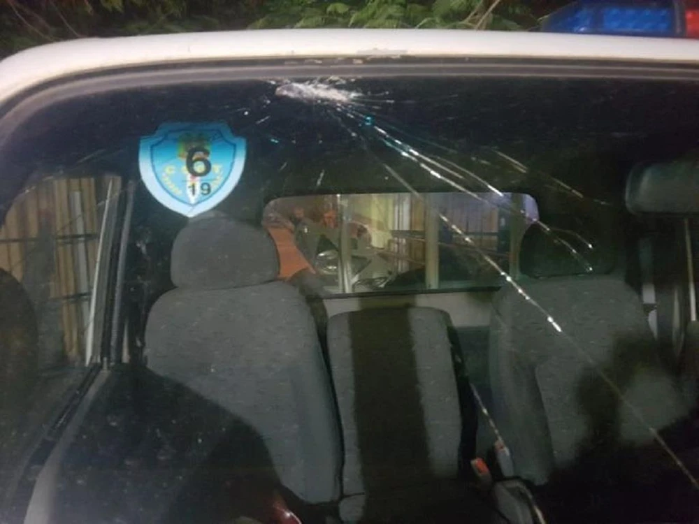 Chiếc xe chuyên dụng của CSGT bị ném vỡ kính chắn gió.