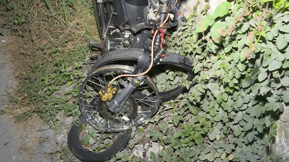 Chiếc xe máy bị hư hỏng nặng và có dính máu được phát hiện trong bụi rậm cách hiện trường 50 m