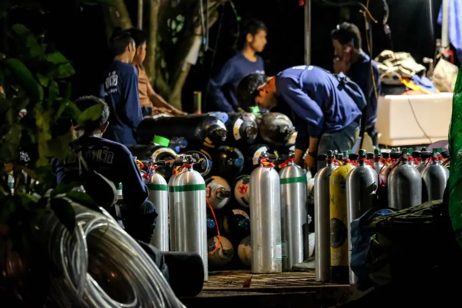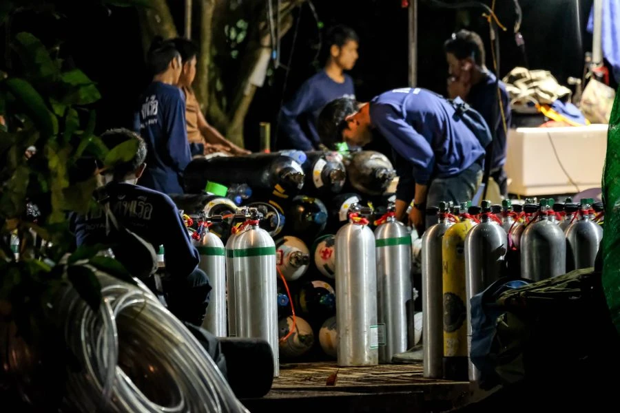 Các bình dưỡng khí được chuẩn bị tại một khu trại dã chiến gần lối vào hang động. Ảnh: GETTY