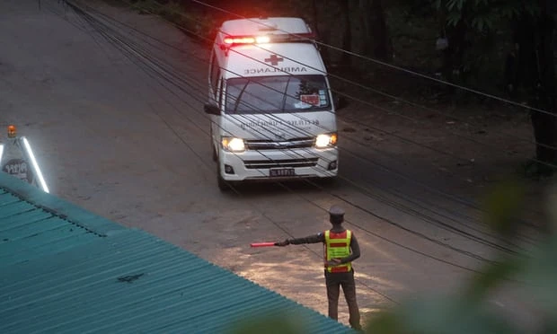 Một xe cứu thương rời khỏi miền Bắc Thái Lan vài giờ sau khi chiến dịch giải cứu đội bóng mắc kẹt trong hang bắt đầu. Ảnh: AP