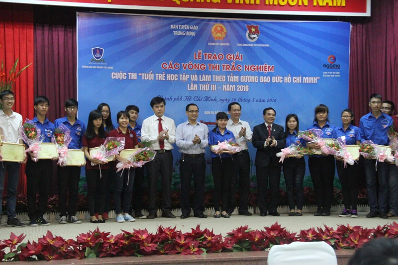 Ban tổ chức trao giải cho các thí sinh tham gia cuộc thi "Tuổi trẻ học tập và làm theo tấm gương đạo đức Hồ Chí Minh". Ảnh: P.ĐIỀN