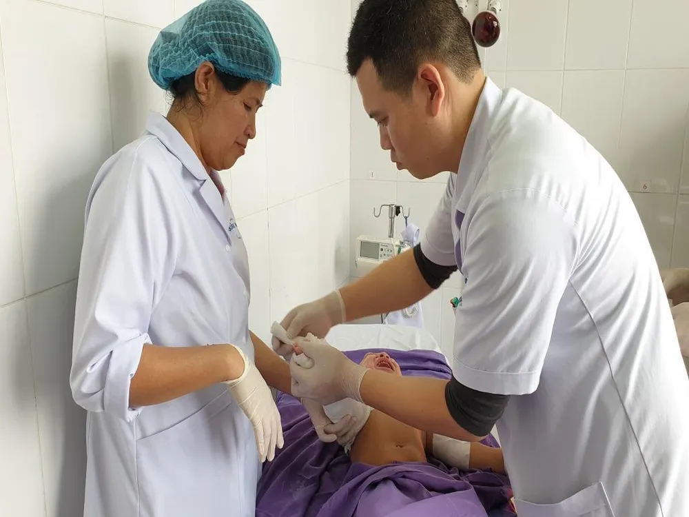 Các bác sĩ (BS) tại BV Sản Nhi Quảng Ninh chẩn đoán bệnh nhi bị bỏng nước sôi độ II, III ở vùng cằm, cổ, ngực, cánh cẳng tay phải, được điều trị thay băng bỏng và điều trị nội khoa.