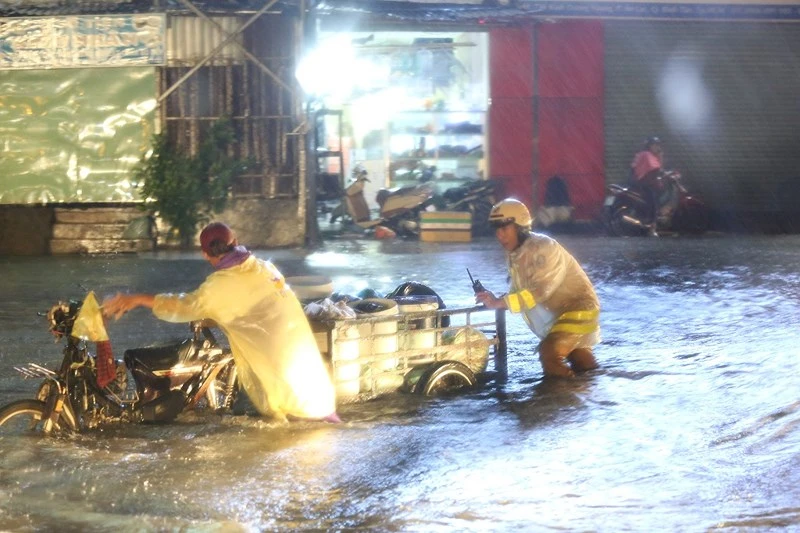 Đội CSGT An Lạc đẩy xe ba gác chết máy, bị ngập nửa bánh xe trên quốc lộ 1 tối 25-11. Ảnh: LÊ THOA