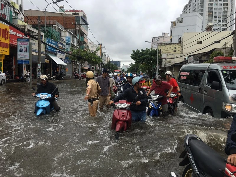 Đường Huỳnh Tấn Phát (quận 7) ngập trắng nước, hàng loạt phương tiện phải dắt bộ. Ảnh: NGUYỄN TÂN
