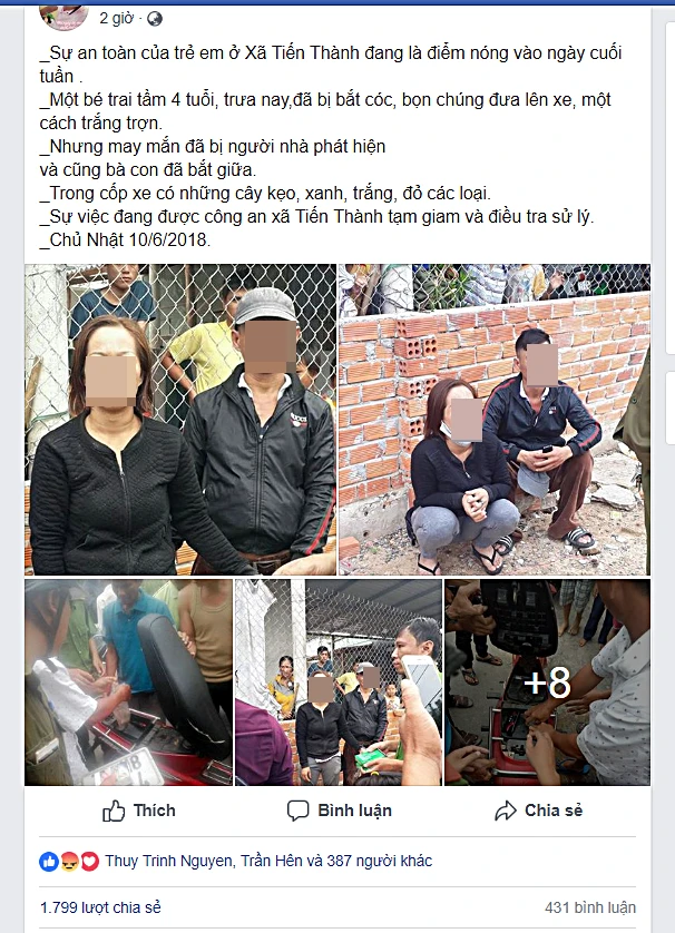 Khoảng 12 giờ trưa nay (10-6), một tài khoản trên mạng xã hội đưa thông tin kèm hình ảnh cho rằng vừa bắt quả tang một vụ bắt trẻ em tại xã Tiến Thành, TP Phan Thiết (Bình Thuận) đã thu hút hơn 1.700 lượt chia sẻ cùng hàng trăm bình luận.