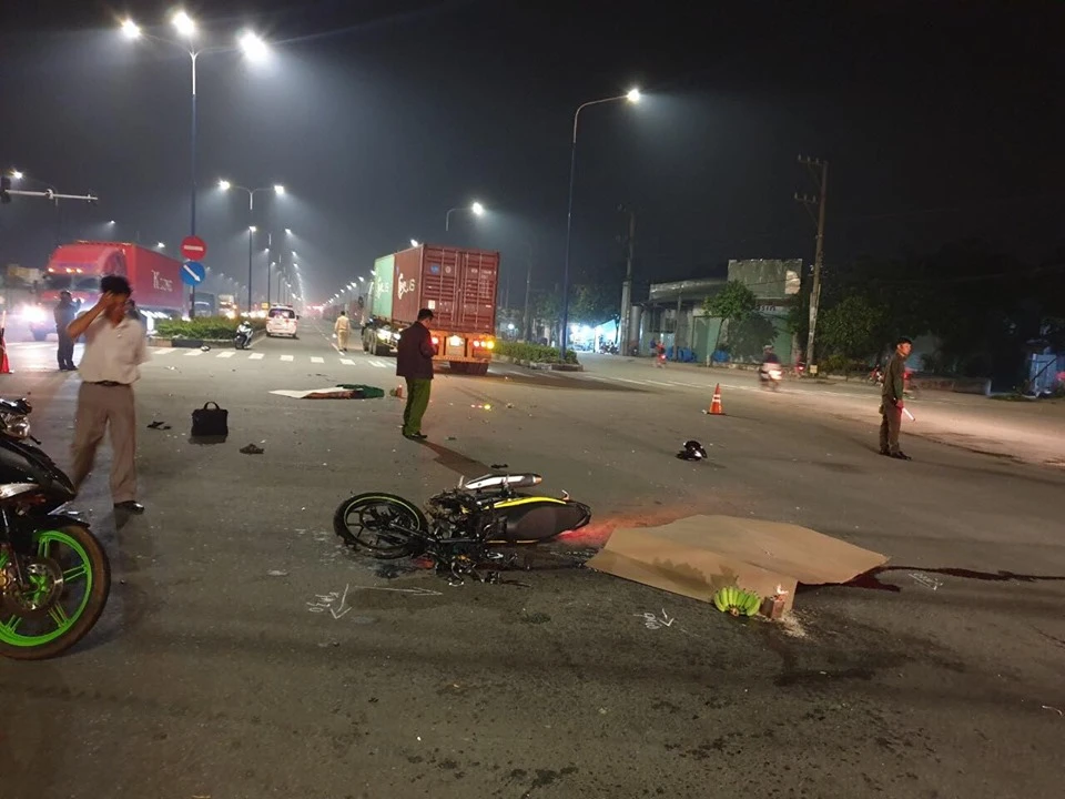 Sau va chạm, hai vợ chồng ngã ra đường và bị xe container cán qua tử vong tại chỗ.