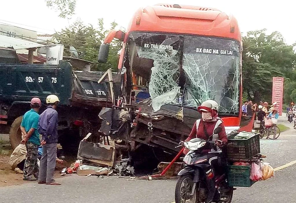 Tài xế đánh lái khiến xe khách lao vào xe ben đang đậu. Ảnh: THIỆN NHÂN