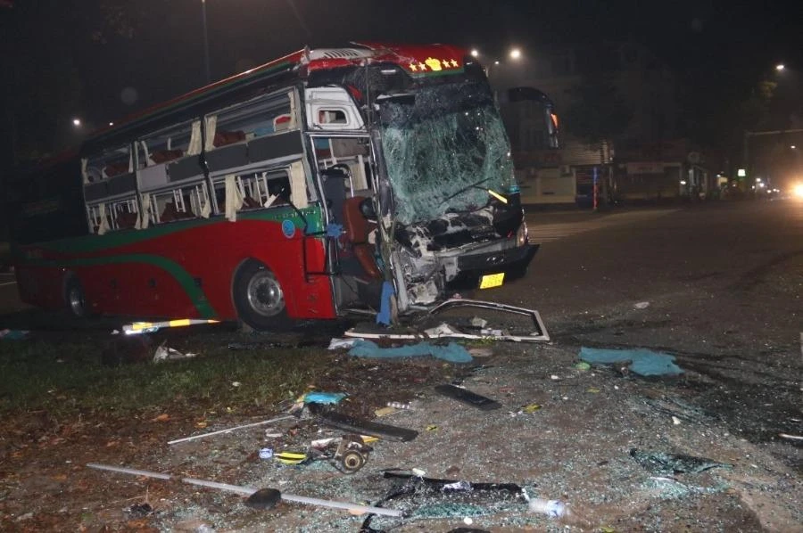 Đầu một chiếc xe khách bị hư hỏng nặng sau cú tông mạnh. Ảnh: LA