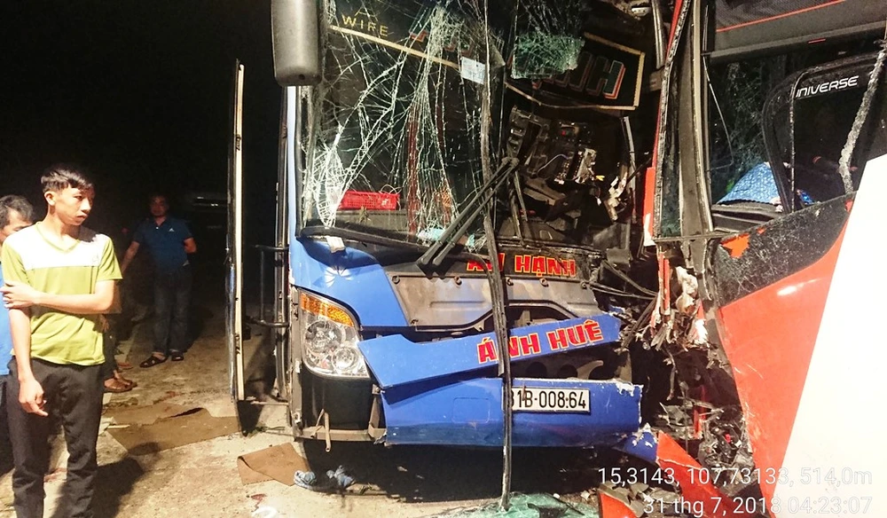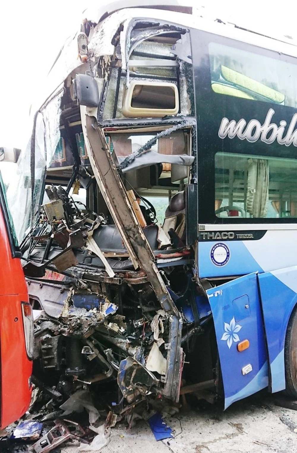 Tại hiện trường, 2 phương tiện hư hỏng nặng phần đầu, kính chắn gió vỡ nát, tài xế Dũng bị thương nặng và hàng chục hành khách trên 2 xe hoảng loạn, kêu cứu.