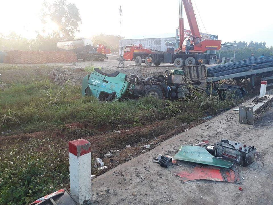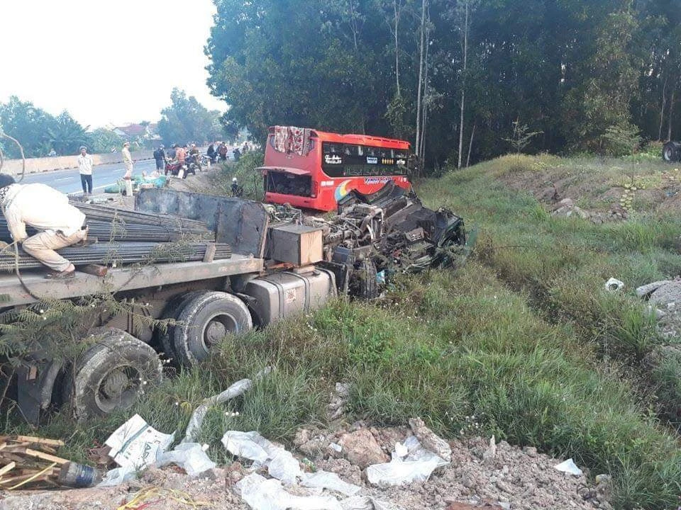Tại hiện trường, chiếc xe tải bị lật, biến dạng phần đầu, còn xe khách bị hư hỏng nghiêm trọng.