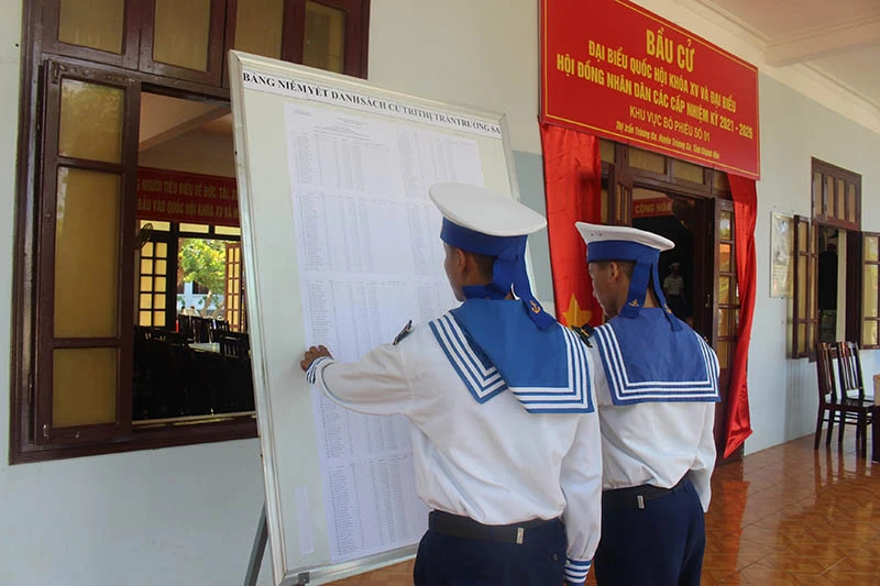 Sáng 16-5, quân và dân tại 20 điểm bỏ phiếu ở huyện đảo Trường Sa (Khánh Hòa) đã bỏ phiếu bầu cử đại biểu Quốc hội khóa XV, HĐND các cấp nhiệm kỳ 2021-2026, sớm hơn một tuần so với cả nước. Những điểm bỏ phiếu này thuộc hai xã đảo Sinh Tồn, Song Tử Tây và thị trấn Trường Sa.