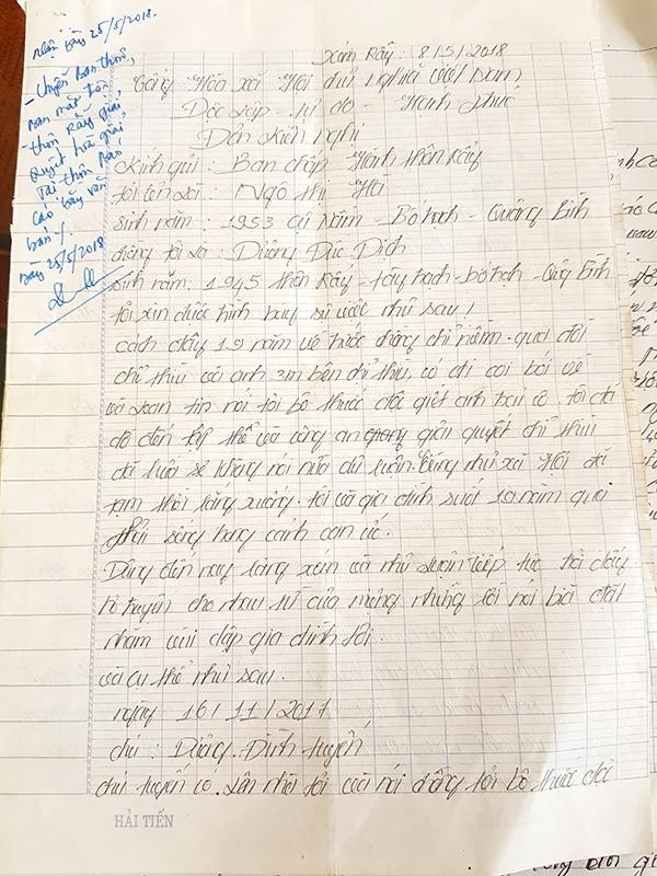 Quá đau khổ, ngày 25-5 vừa qua, bà Hà làm đơn cầu cứu xã, xã bút phê chuyển về ban mặt trận thôn giải quyết. Trưởng thôn Rẫy tổ chức họp với đầy đủ ban bệ của thôn, kể cả hai đối tượng nói nhà ông Dịch bà Hà bỏ thuốc độc. Tuy nhiên, cuộc họp cũng không giải quyết dứt điểm. Sự việc cứ âm ỉ như thế suốt gần bốn nhiệm kỳ lãnh đạo xã…