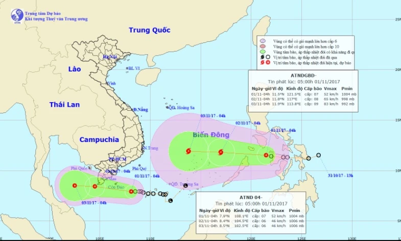 Dự báo trong 24 giờ tới, ATNĐ di chuyển theo hướng Tây Tây Bắc, mỗi giờ đi được khoảng 20km và có khả năng mạnh lên thành bão. Chiều nay (1-11) bão sẽ đi vào biển Đông. Đến khoảng 24 giờ ngày 2-11, vị trí tâm bão ở vào khoảng 11,8 độ Vĩ Bắc; 117,0 độ Kinh Đông, trên khu vực phía Đông biển Đông cách đảo Song Tử Tây khoảng 300km về phía Đông.