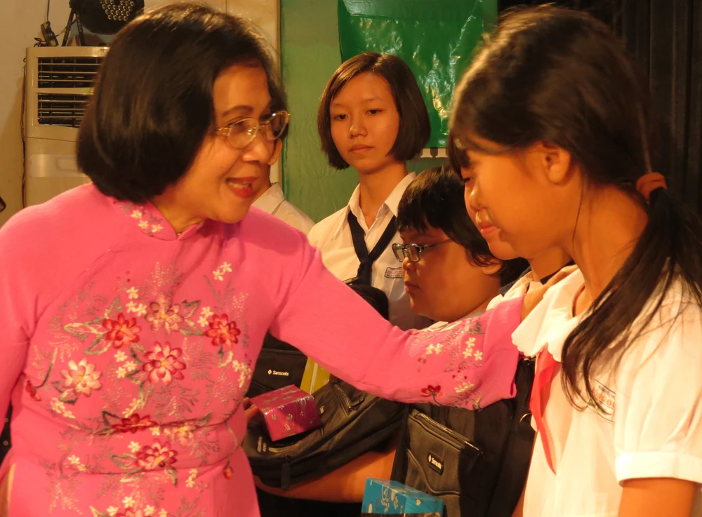 Bà Nguyễn Thị Thu Hà, Phó Bí thư Thành ủy TP.HCM tặng quà cho các học sinh.