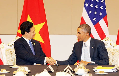 Thủ tướng Nguyễn Tấn Dũng và Tổng thống Obama vui mừng trước những tiến triển đạt được trong quan hệ hai nước trong cuộc gặp tại Myanmar năm 2014. Ảnh: VGP