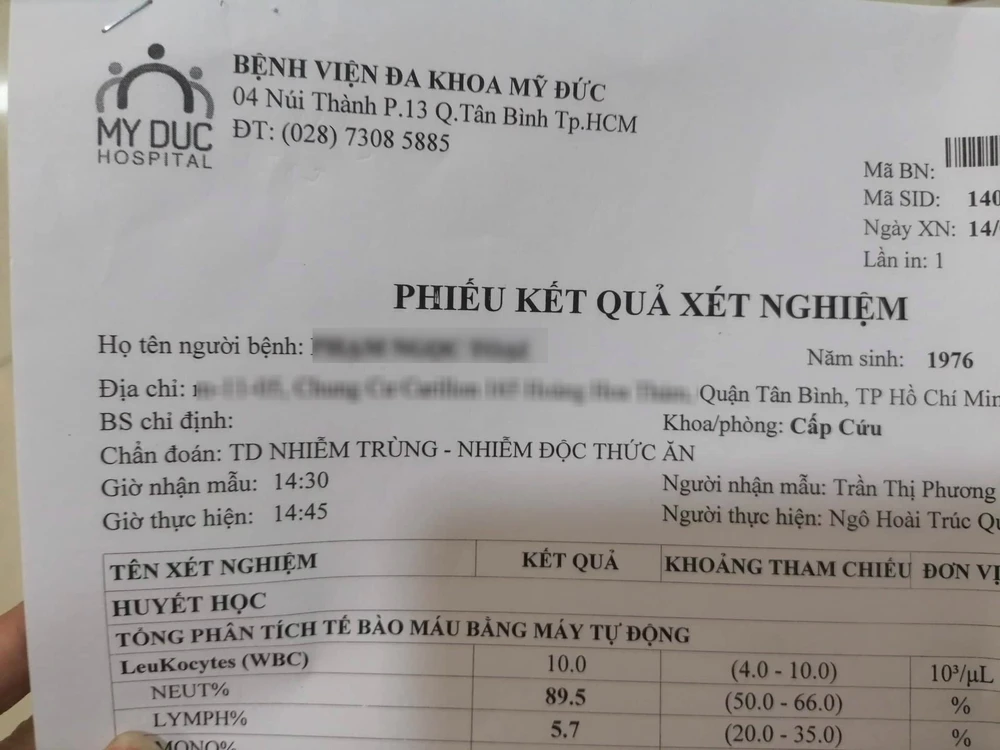 Anh T. cho biết hiện tại mọi người điều trị ở BV Mỹ Đức đã về nhà nhưng vẫn còn đau bụng nhiều, mệt lả. Anh và vợ - chị NTR do thấy đau quằn quại nên hiện đã tiếp tục nhập BV Quận Tân Bình để điều trị.