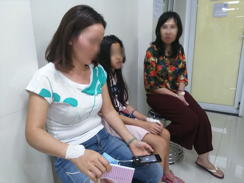 Vợ con và người bà con, bà H. điều trị ở BV Mỹ Đức. Ảnh: HL
