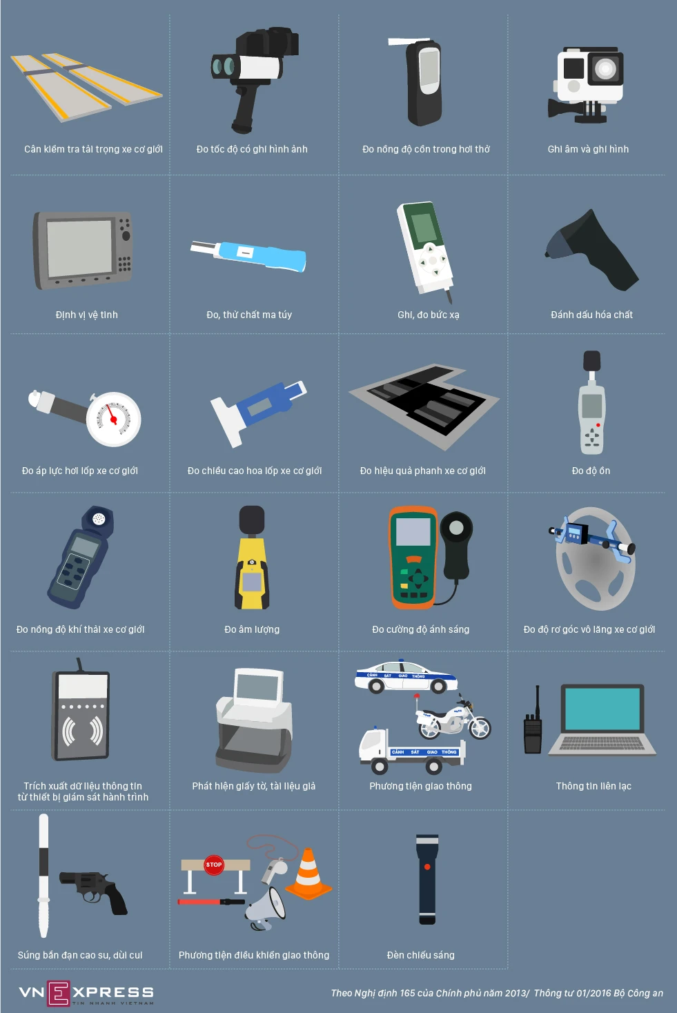 Ngoài phương tiện giao thông, cảnh sát giao thông còn được trang bị 20 loại thiết bị, công cụ hỗ trợ như súng bắn đạn cao su, máy phát hiện giấy tờ.