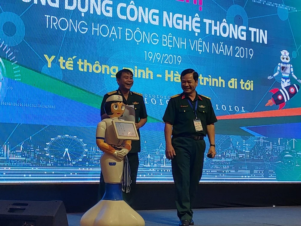 Sản phẩm Robot Tấm đón tiếp người bệnh, một trong những ứng dụng của Bệnh viện Quân dân Y miền Đông. Ảnh: HL