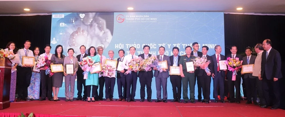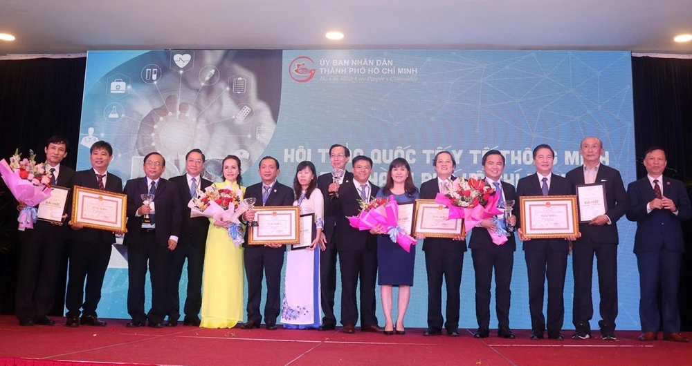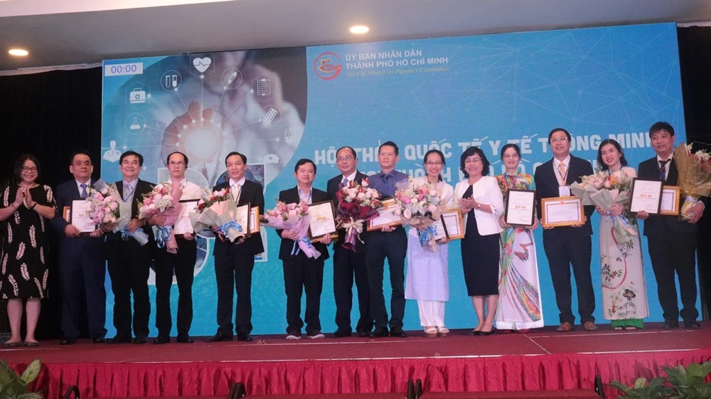 Phó Chủ tịch UBND TP.HCM Lê Thanh Liêm trao giải nhất cho các đơn vị đạt giải thưởng "Y tế thông minh" năm 2019. Ảnh: HL