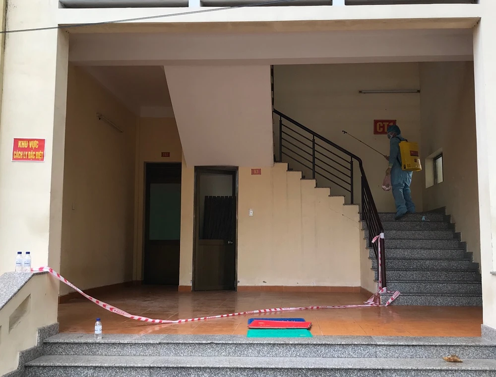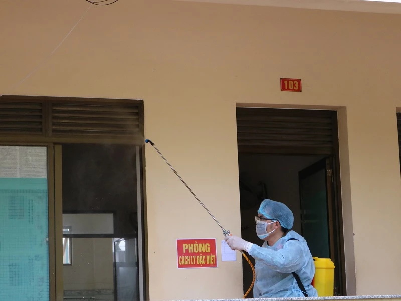 Sau khi mọi người ra về, các cán bộ, chiến sĩ phải khử trùng những dãy phòng họ đã sử dụng trước đó. Ảnh: THANH TUYỀN