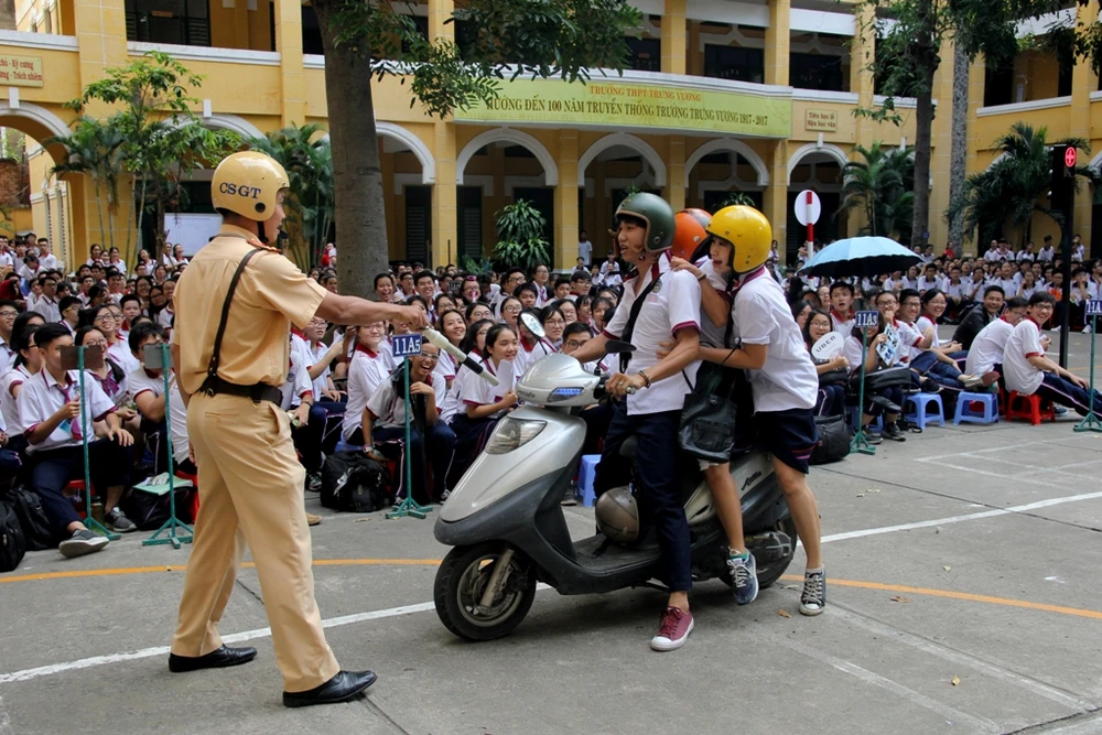 Học sinh tham gia giải quyết tình huống vi phạm giao thông. Ảnh: HOÀNG GIANG