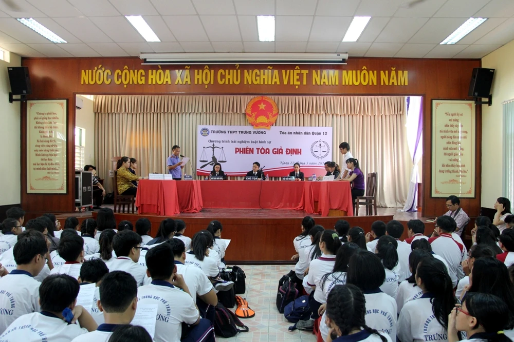 Nhằm cho các em HS hình dung rõ hơn về luật hình sự, nhà trường đã phối hợp với TAND quận 12 tổ chức phiên tòa giả định cho các em tham gia trực tiếp.