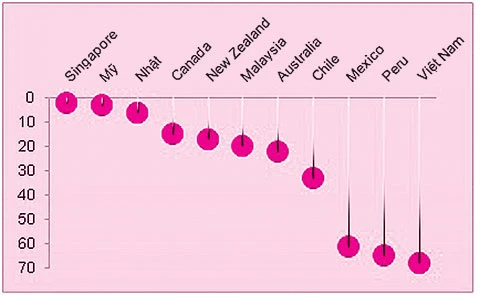 So sánh năng lực cạnh tranh của các nước tham gia TPP. Việt Nam xếp hạng thấp nhất trong 12 quốc gia của TPP. Nguồn: Diễn đàn Kinh tế Thế giới WEF