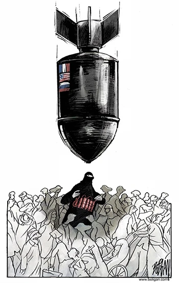 Nỗi lo bọn khủng bố trà trộn trong dòng người di cư. Biếm họa của ANGEL BOLIGAN (báo El Universal của Mexico)