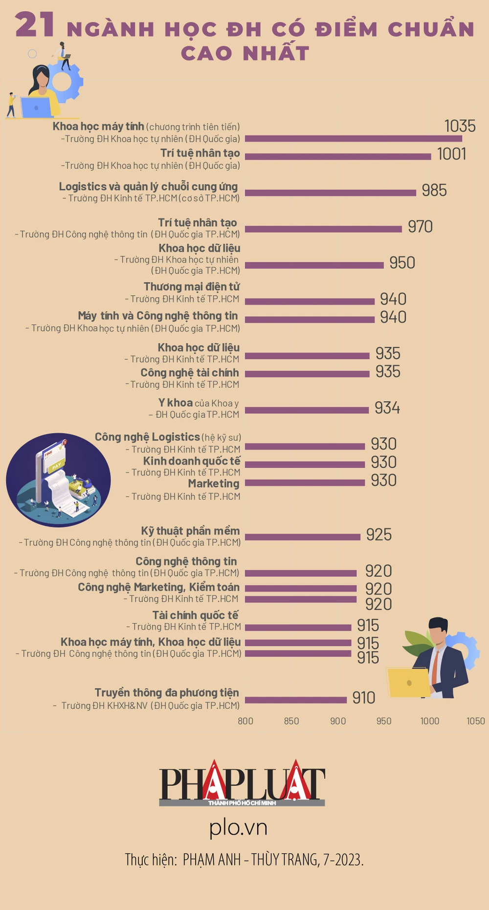 (PLO)- Theo thống kê của ĐH Quốc gia TP.HCM, năm nay, tổng kỳ thi ĐGNL có hơn 101.000 thí sinh dự thi để xét tuyển vào hơn 90 trường ĐH-CĐ. Ngành có điểm chuẩn cao kỷ lục nhất đến thời điểm này là ngành Khoa học máy tính (chương trình tiên tiến) có mức điểm 1.035 và ngành Trí tuệ nhân tạo với mức điểm 1.001, đều thuộc Trường ĐH Khoa học tự nhiên (ĐH Quốc gia TP.HCM).