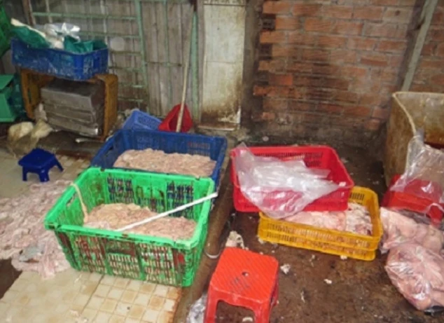 Tại thời điểm kiểm tra, đoàn ghi nhận lòng heo dính phân, đất nằm tênh hênh trên nền nhà bẩn thỉu. Chưa hết, vài công nhân dùng chân giẫm, đạp lên lòng heo rất mất vệ sinh. Toàn bộ hơn 2,2 tấn lòng heo không chứng từ, nguồn gốc.