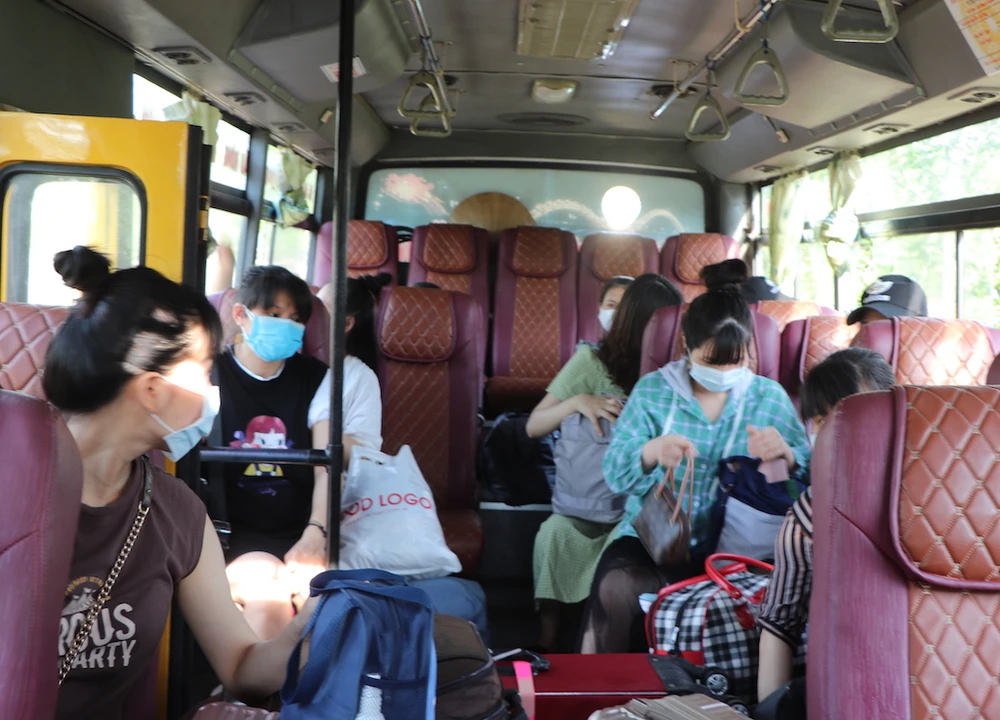 Các thai phụ lên xerời khu cách ly tại Trường Trung cấp Cảnh sát Nhân dân 5. Ảnh: TN