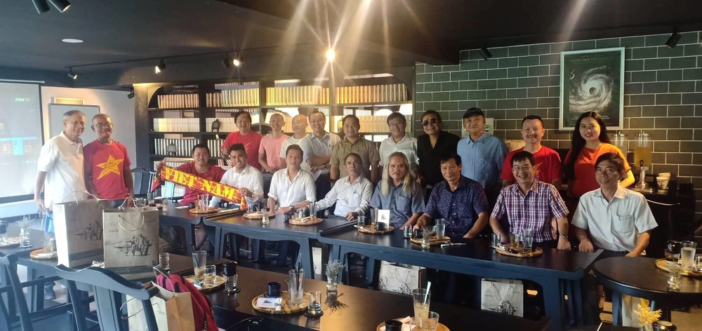 Các nhạc sĩ, ca sĩ và fan đội tuyển Việt Nam chụp ảnh lưu niệm.
