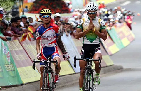 Tay đua Nguyễn Thanh Tâm (phải) ăn mừng chiến thắng chặng 16 Phan Rang - Đà Lạt. Ảnh: MQ