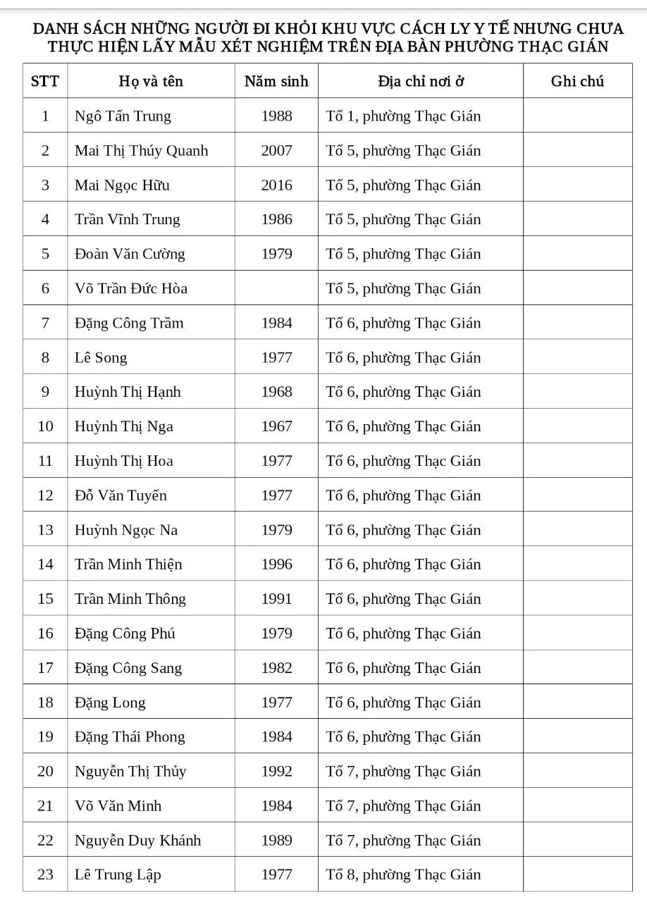 Ngày 21-6, UBND phường Thạc Gián (quận Thanh Khê, Đà Nẵng) cho biết trên địa bàn phường có 23 người có hộ khẩu thường trú tại khu dân cư Tam Giác 2 (thuộc khu vực cách ly y tế) chưa thực hiện lấy mẫu xét nghiệm COVID-19 đã đi khỏi địa phương.