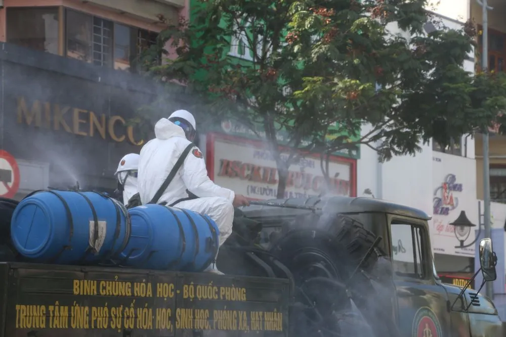 Lực lượng quân đội phun khử khuẩn các địa điểm liên quan đến bệnh nhân COVID-19. Ảnh: T.AN
